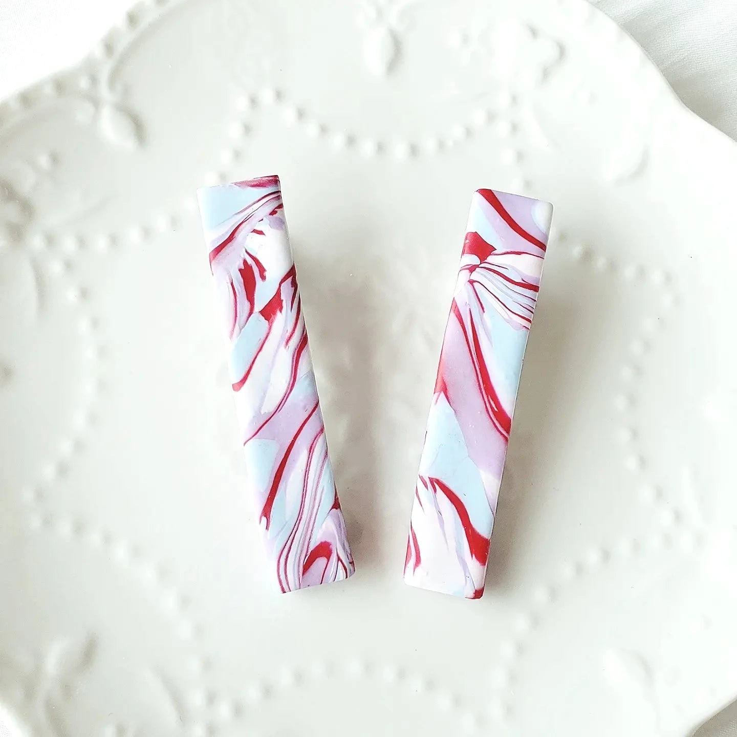 These statement clips are made from lightweight polymer clay, with silver clip backs. Each pair is individually handmade to order so may differ slightly from the photo and may take up to 7 working days before shipping.