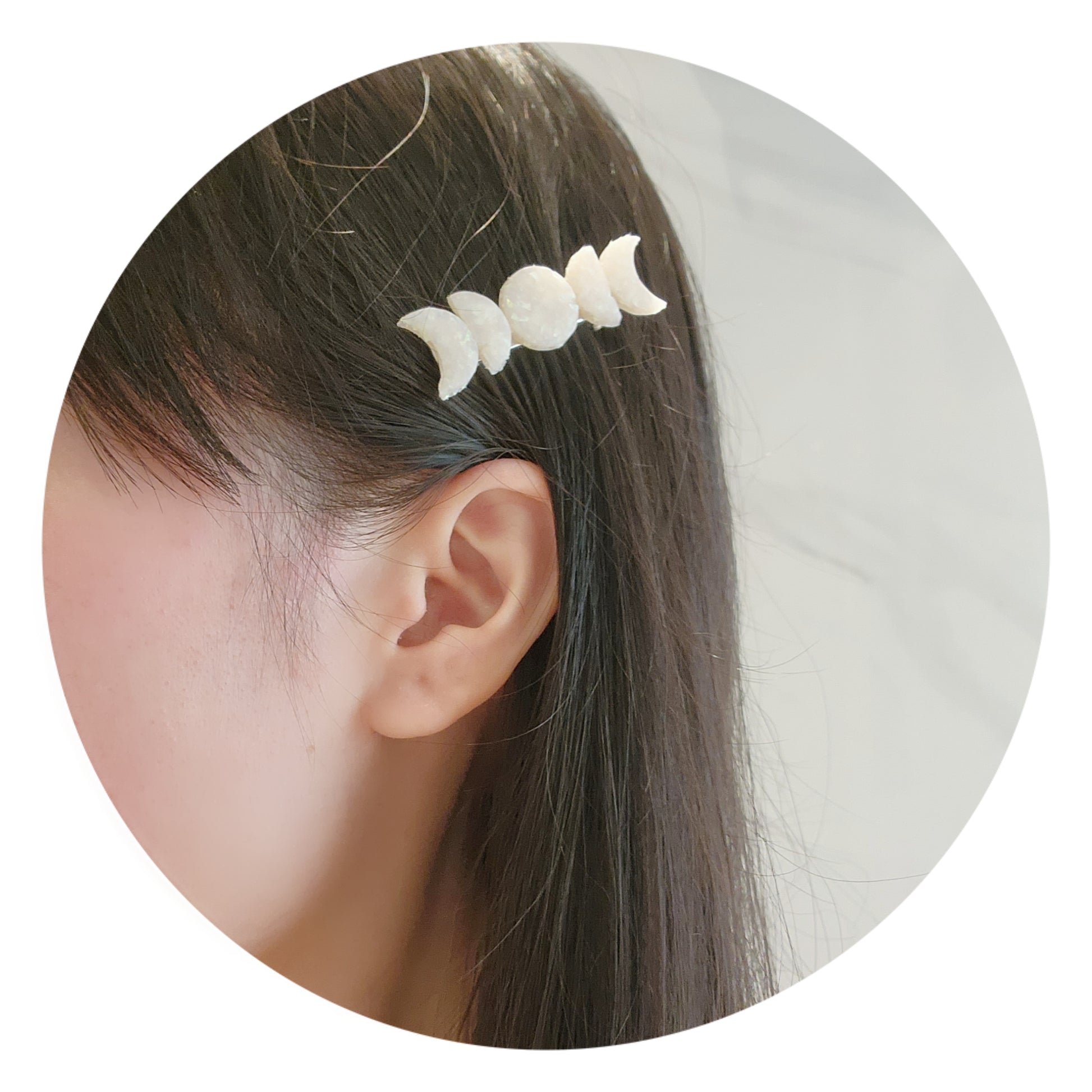 Phases of the moon in opal with a glossy finish. These are set onto a crocodile clip for maximum hold in your hair. If you would like it in a different color, let us know!